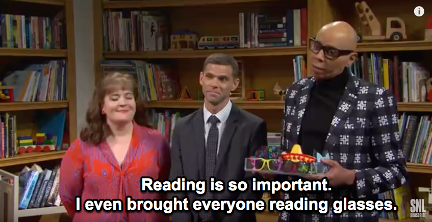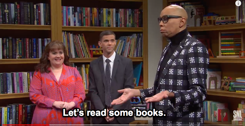 A good illustration of the general idea of applying different readings to texts–of how to “read”–is offered in a recent SNL sketch in which Ru Paul visits a library to read to children.