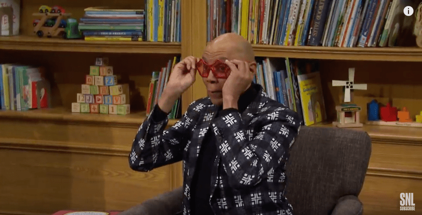 It is also significant that these are more colorful than the plain black square ones he had on before. These are the lenses through which he will “read for filth,” in essence, reading through the perspective of a drag queen, showing how one can put on these particular symbolic lenses to read any text. By dramatizing the confusion in reaction to Ru’s applying his specific way of reading, the sketch shows how we’re frequently trapped in limited perspectives when consuming content and narratives, and thereby the sketch implicitly highlights the importance of considering other perspectives. Applying theory can help us with this.