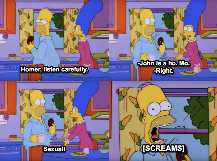 Bridging the gap during this period were two significant pop cultural moments for positive gay representation: The Simpsons episode “Homer’s Phobia,” airing February 16, 1997, guest starring openly gay filmmaker John Waters; and Ellen‘s “The Puppy Episode,” airing April 30, 1997, two weeks after Ellen DeGeneres herself came out as gay on the cover of Time magazine (further conflating pop-culture texts and their real-life counterparts…). The Simpsons episode is a classic example of a character’s unethical actions–Homer’s homophobia–being highlighted in a way that calls attention to their unethical nature (according to Wikipedia, the episode won a GLAAD award). Ellen, of course, was another ballgame entirely–a game-changer.
