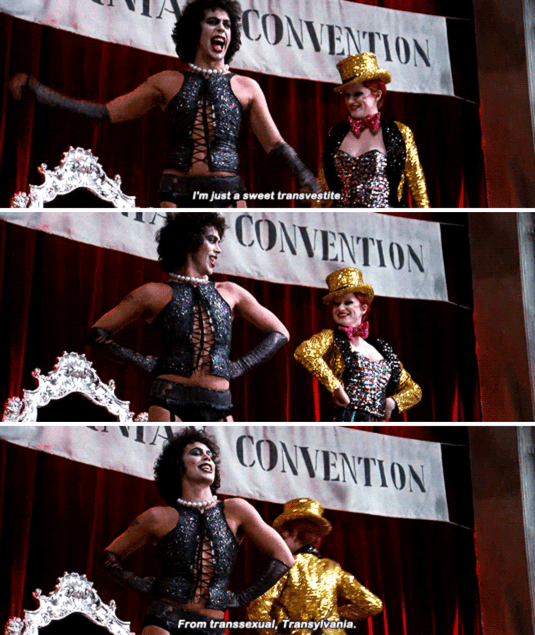 In Castellani’s description, Hudson is “skeletal,” “diseased, emaciated”–horrific, to put it another way, though a different type of horrific than, say, a blood-sucking vampire. Both types of horror being associated with gayness seems reflective of the culture during this time period of the 70s and 80s and its refusal at the time to integrate the gay subculture, distancing it and rendering it “other.” An emblematic reflection of this in pop culture at the time (we’re in a house of mirrors now) would be The Rocky Horror Picture Show, the infamous film version of which, interestingly enough, came out in 1975, the same year as ‘Salem’s Lot. With the character of Dr. Frank-N-Furter, a “self-proclaimed ‘sweet transvestite from Transsexual, Transylvania,'” the film makes direct reference to Dracula, subverting the trope of homosexual-as-villain by putting it on absurd, flamboyant, fabulous display.