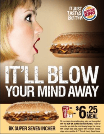 To keep our economy going (for the 1%), desire and/or fear must be kindled and cultivated. Once you understand Freud’s formula (or rather Bernaysian/Hegelian manipulation of it), this isn’t all that difficult to do. It can be done quite simply with an image. If you’re driving in your car or sitting on your couch and see an image of a burger on a billboard or a television screen, then you very well might get an inclination to eat and end up eating a burger when you would not have otherwise. Of course, with increasing capitalist competition, if you encounter a bunch of different images of burgers, then the message the picture is sending might need to be refined to gain an edge over its competing images, and hence make more specific appeals to those primal unconscious urges: