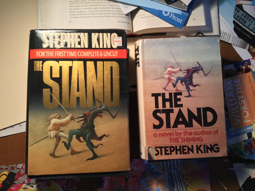 The second problem is multiple editions: I did not read the version of The Stand published in October of ’78, which is no longer in print. The one that the King consumer will most likely find when searching for this title now is the “Complete & Uncut” edition, published on January 1, 1990. In his characteristically chatty preface to this ’90 edition, King describes how the version he submitted to his publisher in the 70s had to be cut by some 400 pages, and this version was reinstating some (albeit not all) of that material. He also notes that some people thought the original version was already too long so…buy at your own peril, basically.