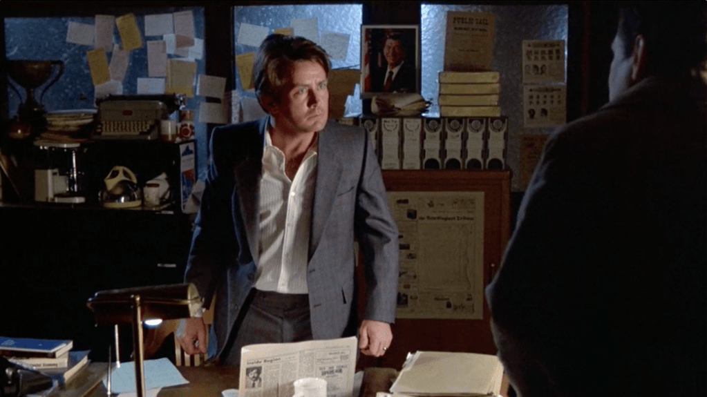 The parallels between Stillson as politician-actor and Reagan as actor-politician cannot be overlooked. … Cronenberg’s … seemingly conservative nature is instead a harsh criticism on the Reagan years, the rise of the conservative right, and the institutionalized racism suggested both by the group of white men to whom Stillson announces “the missiles are flying” in Smith’s vision and by the conspiracy theory that connected the CIA to the rising crack epidemic in the inner cities of America.