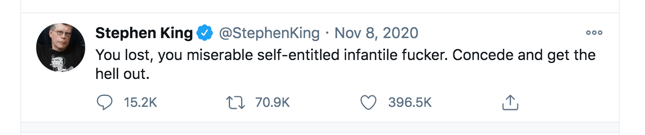 Johnny resorts to violence to prevent violence, taking an action the novel seems to both deem necessary and valorize without acknowledging its parallels to the logic (or lack thereof) of the arms race. And I have to say that King seems to be doing nothing so much as sinking to a Trumpian level when he explicitly involves himself in today’s politics: