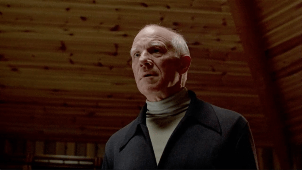Dodd’s black vinyl raincoat is a more utilitarian attribute in the novel, as we see when we’re in the killer’s point of view that he wears it specifically because it is “slick” and thereby impedes his victims from fighting him off. John’s coat with its noticeably large collar is utilitarian for the harsh wintry Maine landscape in which he finds himself; shots of him in this landscape further reinforce him as outsider in an allegorical reading of the film as a white man experiencing the horror of what it is to be Black in America–which is necessarily White America. (Kind of like the It’s Always Sunny in Philadelphia episode “The Gang Turns Black” from January 2017, but less on the nose.) Though this analogy kind of falls apart in the face of John’s sort-of-selfless willingness to sacrifice himself to save America–which is necessarily White America, though figures like Stillson (and Reagan and Trump) are working to make it even whiter….