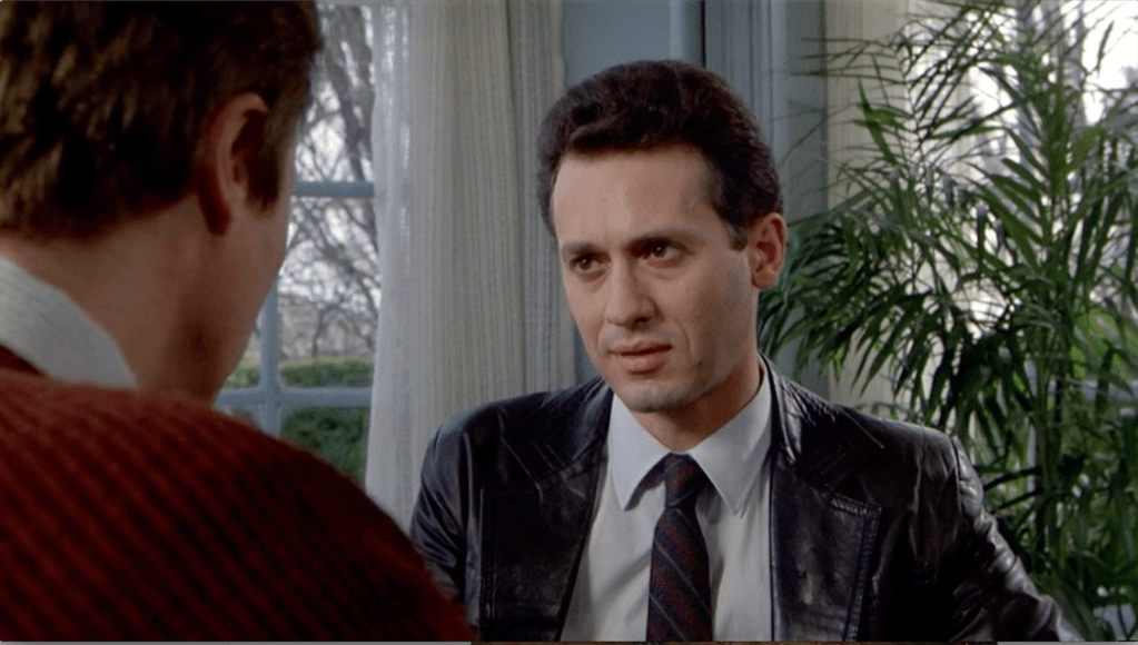 If Stillson is an alter ego for Reagan (and/or Trump), then this might lend credence to or in turn be supported by the theory that Dodd is Johnny’s alter ego, an aspect the movie develops more than the novel by seeming to extrapolate from a detail the novel attributes to Dodd–his wearing a black vinyl raincoat–and using Johnny’s coat to define an aspect of his character in turn.