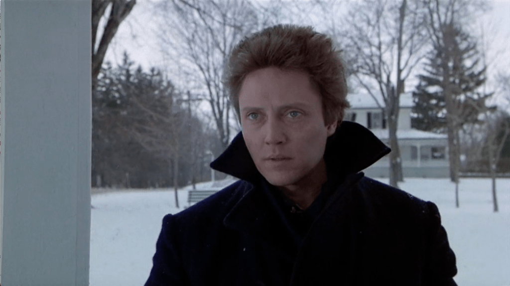 Just as King’s Dark Tower is the nexus of the space-time continuum and Castle Rock is the nexus of the Kingverse, King himself exists at the nexus of reciprocal influence between film, literature, television…and cocaine. In The Dead Zone, Johnny likes to ask Sarah in a flirty way that signifies their love for each other if she’s still “doing that wicked cocaine”–a teasing tidbit whose absence from David Cronenberg’s 1983 film adaptation of the book is the jumping-off point of Sarah E. Turner’s academic essay “Reaganomics, Cocaine, and Race: David Cronenberg’s Off-Kilter America and The Dead Zone.” Cronenberg develops an aspect of John’s character that the novel doesn’t via both the landscape–snowy, white–and John’s overcoat–black, large collar necessarily turned up against the former.