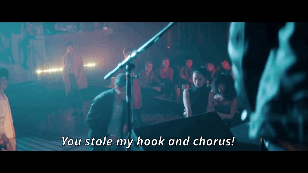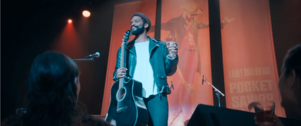 When Larry is introduced in episode 2, he is trying to play a poorly attended show to promote his new album Pocket Savior without his sick-with-superflu bandmates. He sits solo with his acoustic guitar and introduces, by name, the song “Baby, Can You Dig Your Man?” It was several rewatches of this scene before I understood what Larry mumbles after naming the song here: “Here’s what ‘Baby, Can You Dig Your Man?’ sounded like…before it was used to sell fucking cologne.” But before Larry can start to play it, in stumbles (white) Wayne Stukey, inebriated, sick, and hollering that he bets Larry “made a nice chunk of change off that…put you right on the map, huh?” Larry shoots back that Wayne must be “getting high off his own supply,” which we understand at this point, less than seven minutes into the episode, is highly hypocritical of Larry, whom we have already seen snorting a supply he presumably got…from someone, which then implies Larry is being disingenuous in this scene in a way that validates Wayne’s accusations: by way of a bit too much expositional detail, Wayne announces that when they were roommates, he and Larry used to listen to “my records” and that when Larry moved out he “stole stuff, too,” and that that’s “not all” Larry “stole.” Wayne then flies into a rage as he ascends the stage declaring that Larry “stole my hook and chorus,” and a clumsy fist-fight ensues.