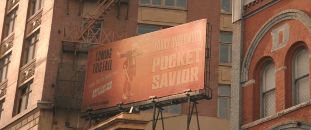 (When Heather Graham’s Rita Blakemoor says that Larry could be “up there forever” on this “Pocket Savior” billboard featuring him in explicitly crucified imagery…is she referring to the inevitable permanence/effects of foundational conflicts enacted by musical cultural appropriation…?)