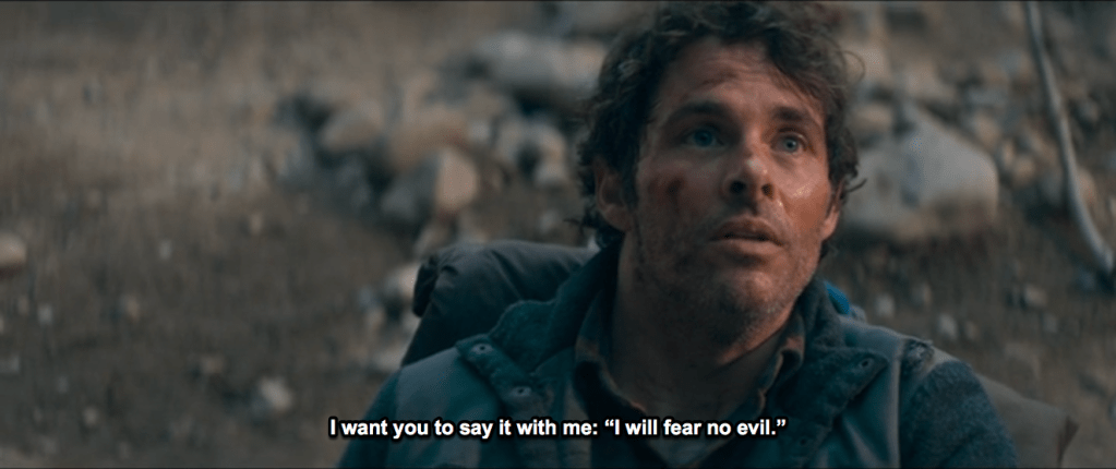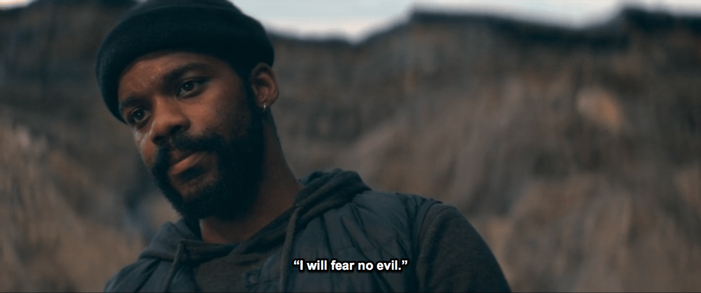 Larry’s character gains new agency in at least two ways in 2020. The climax of his arc is in Episode 8, the penultimate episode itself titled “The Stand.” One good dramatic change is that in 2020 Nadine does not kill herself before the three Standers arrive in Vegas from the Free Zone; instead, Larry is able to reveal to her the truth of what she’s really turned into and that Flagg is just using her, which then causes her to take the leap that kills both her and Flagg’s unborn child. Not great for Nadine’s agency but good for (Black) Larry’s. Then Flagg sends Larry part of Nadine’s head as an intimidation tactic, but Larry turns the meaning of this…on its head, able to read it as a sign that Flagg is weakening rather than strengthening as Flagg intends him to read it. Larry’s arc is strengthened alongside Lloyd’s as Lloyd’s refusing to kill Larry is the occasion for him to take his own stand against Flagg, which Lloyd never does in the book. Flagg wants Lloyd to kill Larry because Larry also does something he doesn’t in the book: he starts chanting “‘I will fear no evil.'” This is shown to inspire others present to rebel, which in the book happens for a less concrete reason that Larry is only indirectly rather than directly responsible for.