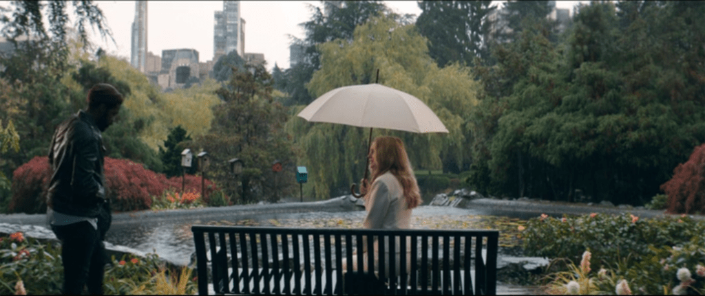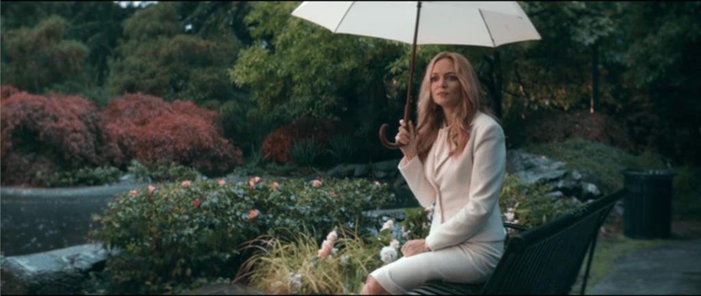 The 2020 reference to Hendrix might further illuminate another function of reinstating Rita Blakemoor: to show Black Larry have sex with her. When Rita first appears in the book, she’s “dressed in expensive-looking gray-green slacks and a silk off-the-shoulder peasant blouse,” but in 2020, Rita’s inaugural outfit has been upgraded to a pristine white skirt suit, and when we (and Larry) first see her in this getup sitting straight-backed on a bench beneath an umbrella, the shot seems intended to invoke an impressionist painting. And the white suit seems designed to…heighten her whiteness?