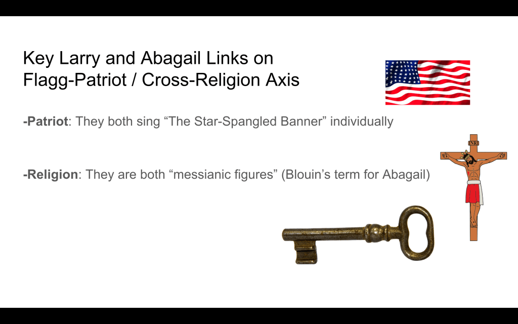 This particularly American thematic axis that “Flagg” and “Cross” constitute offers a relevant framework to dissect the significance of Larry Underwood and Abagail Freemantle’s characters through some critical connections they share: