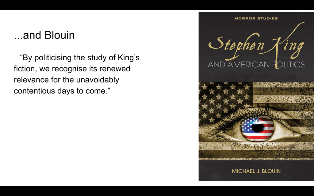 Blouin, Michael J.. Stephen King and American Politics (Horror Studies) (p. 11). University of Wales Press. Kindle Edition.