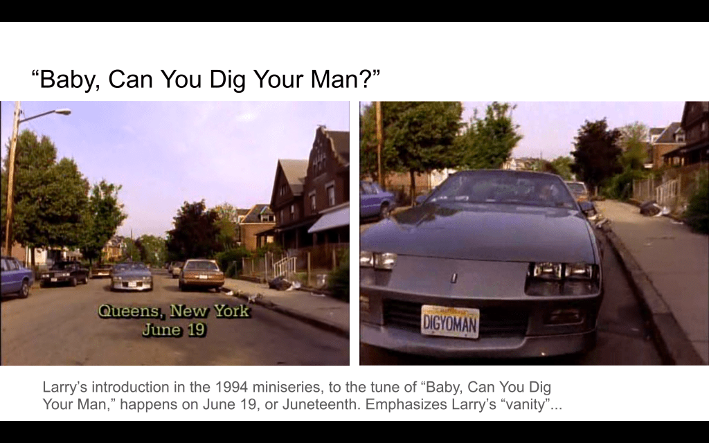 Also, if the text of the 2020 show validates/legitimizes Wayne’s claim that Larry stole his “hook and chorus,” that means that in 2020, a white man still wrote the Black essence parts of “Baby, Can You Dig Your Man?” and by way of Larry’s necessary redemption arc, designates Larry’s plagiarizing-taking as a problem larger/more significant than Wayne’s appropriating-taking. It reinforces the idea that Wayne “owns” this song (or at least its essence).