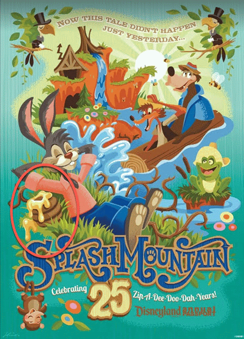 If an “iteration” of something is a “version” of it, one “iteration” of the critter–or as I will term it, a “critteration”–is the animated version as it appears in SoS; another iteration is this textual reference to the critters on the Splash Mountain wall, which is positioned so patrons see it while they wait in line for the ride–meaning it’s positioned for maximum exposure, since patrons will spend more time in line than on the ride itself.
