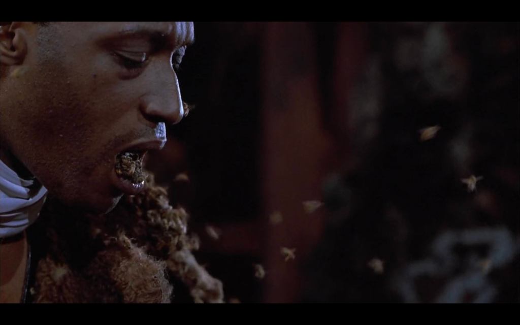 That bees and “sweets” are associated with the implicitly Africanist presence in Barker’s ’85 text seems mostly like an arbitrary device to evoke horror, since that text mentions nothing about the Candyman’s backstory–i.e., there’s not an explanation of why bees should be(e) the sign of this particular presence as there very definitively is in the ’92 version (side note: the maniacal laughter of the white professor after his mansplaining of the legend is a highlight of the film for me).