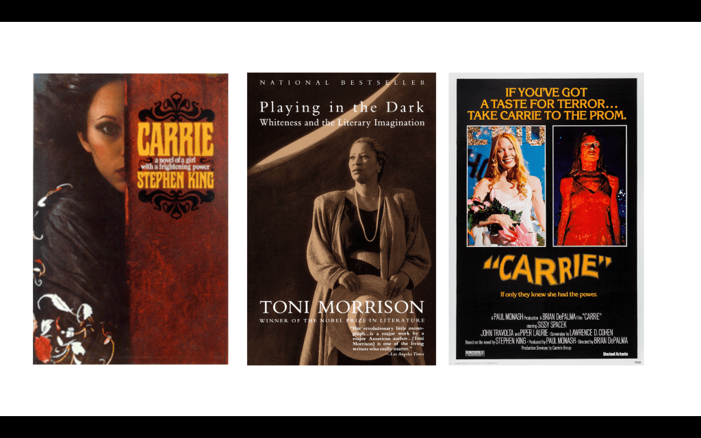 The “Africanist presence” is not only Black characters or explicit references to Blackness/Black people in a given text. It is anywhere you can detect the influence/effects/constructions of Blackness, often in attempts to erase or implicitly/unconsciously marginalize it. It turns out that white characters and entities that are not technically Black can also manifest an Africanist presence. And it turns out that in the text of Carrie (1974), Carrie White herself becomes an Africanist presence, both Black and White, a bifurcated duality implicitly reinforced by the imagery of both the first-edition book cover and movie poster: