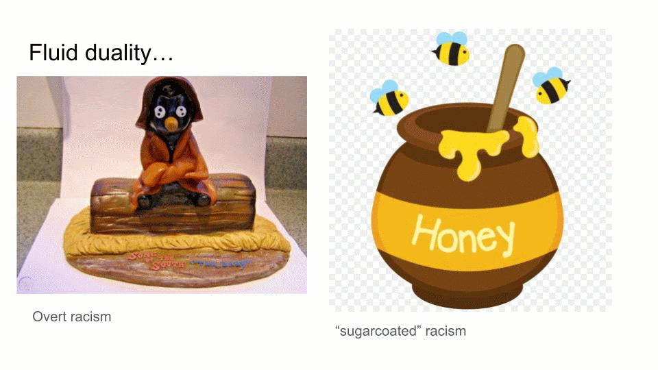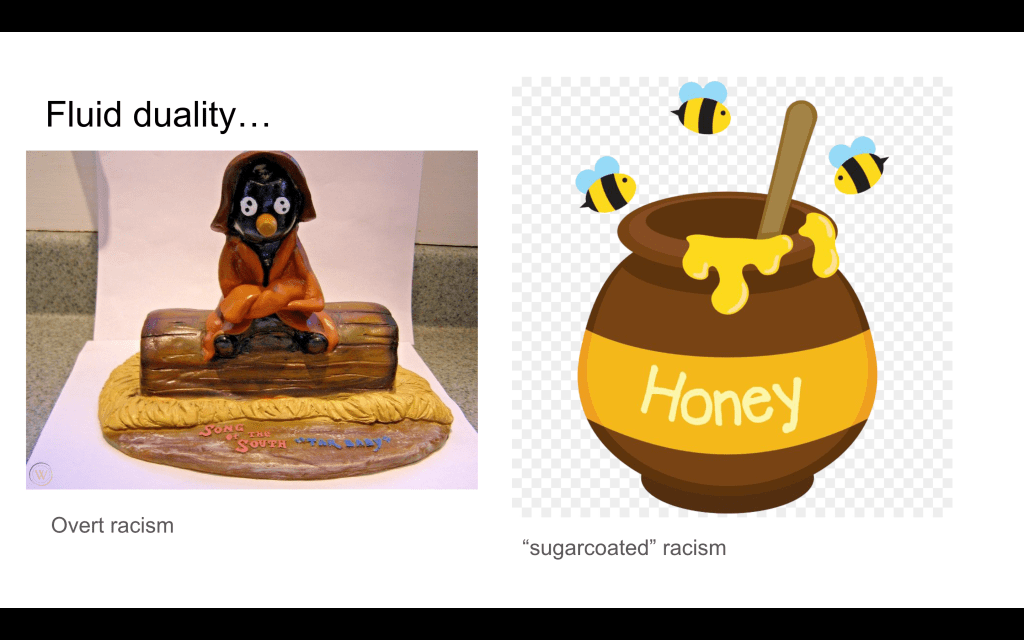 But the vestige that remains–the “critter” quote–is a sign of covert racism. This is the sugarcoating, whitewashing rhetoric of what Sperb terms “evasive whiteness,” expressing a nostalgia for the institution of slavery by way of a likening of human to animal–a likening more insidious for seeming innocuous, a trait it shares with the “Magical Negro” stereotype.