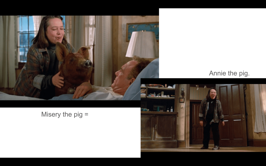 Reading Misery for Toni Morrison’s Africanist presence is nothing short of off-the-chain mind-blowingly bonkers…or more specifically, reading it for the “buried history of stinging truth” as Morrison figures it in the preface for her novel Tar Baby (1981). As a novel about the process of writing itself, Misery symbolically plays out numerous facets of the function of the Africanist presence in American literature. The essential co-authoring of the text-within-the-text of Misery’s Return by protagonist Paul Sheldon and antagonist Annie Wilkes offers a microcosm of the process through which the Africanist presence underwrites (i.e., covertly co-authors) the Western canon. (This aspect of the novel is so bonkers it was left out of the film adaptation entirely.)