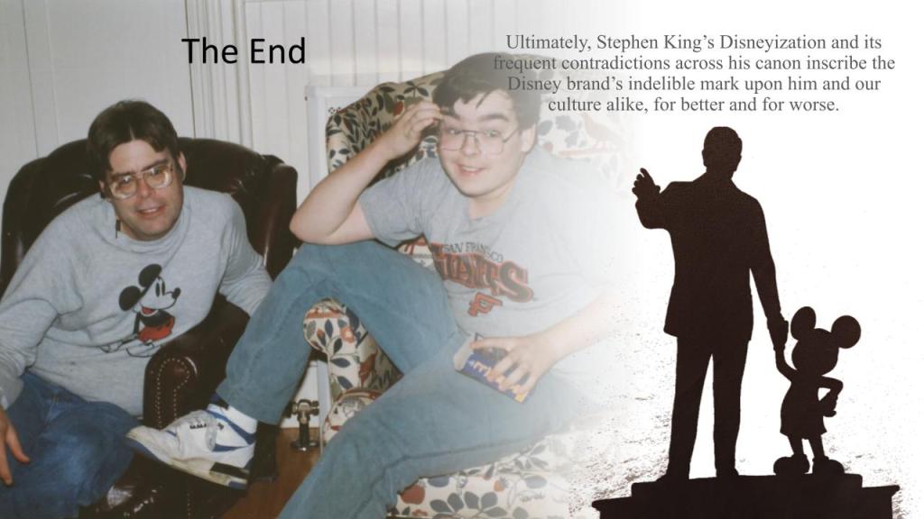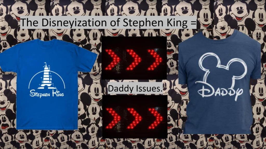 (The Mickey faces in the background are also from a t-shirt; the conflicted emotions they express are also part of the thesis re: Stephen’s daddy issues with Walt. I initially discovered this t-shirt in my hunt to collect t-shirts replicating Stephen King book covers.)