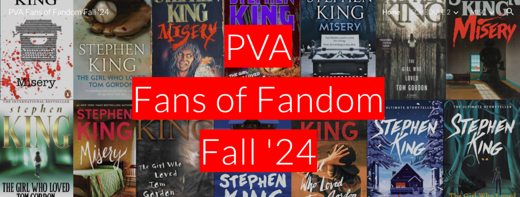 This fall semester I made fandom the basis of the elective I’m teaching at the arts high school, officially entitled Fans of Fandom, with the framework that fandom exists on a spectrum of toxic to life-saving that is represented by King’s novels Misery and The Girl Who Loved Tom Gordon, respectively.