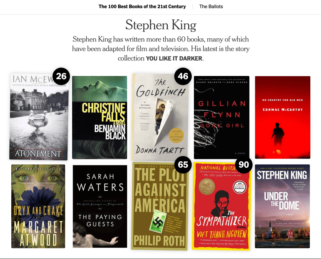I was attending this convention as a bona fide fan, but also as a bona fide King academic scholar interested in its expression of fandom to the extent that I will likely give an academic talk on KingCon and the King fandom at the next PCA conference (which means I am a nerd on two different fronts). And so I found this statement ironic through another lens, that of Michael Blouin’s 2021 study Stephen King and American Politics, which observes that King’s work presents itself as apolitical while in reality being nothing of the sort–not just because it’s generally impossible for anything to be apolitical, but in more of a calculated appeal to the masses. (This argument of Blouin’s proved central to my own Disneyization of King thesis.) Per the pop culture/academia split, Blouin’s title didn’t come up in the post-election bonus episode released on the Kingcast Patreon, “Talking (Scared) Politics with Neil McRobert,” the host of the Talking Scared horror podcast that did an excellent pair of episodes with several different guest writers choosing a King short story to talk about earlier this year. But McRobert did pinpoint Under the Dome (2009) as a political novel of King’s, calling its antagonist Jim Rennie King’s greatest villain. Blouin has a great chapter breaking down Dome as a takedown of Bush-era politics with Rennie representing Dick Cheney. And King selected Dome as one of his picks for the top ten novels of the twenty-first century for the New York Times (I’m pretty sure he’s the only one of the fifty-three writers asked to do so that put a book of his own on their list). He’s also the writer who gets top billing.