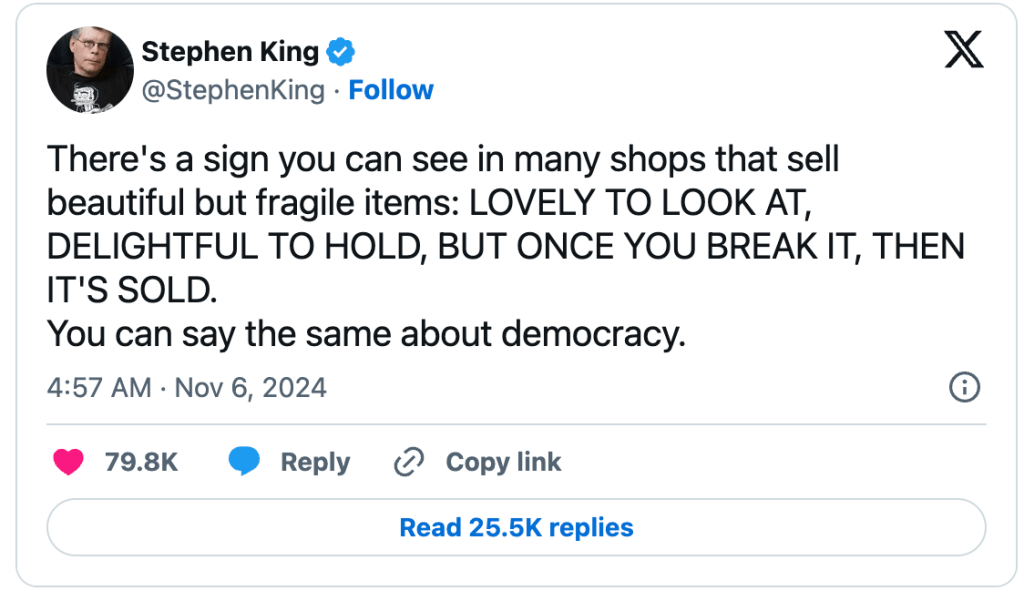 And then, King was banned from X for calling Elon Musk “the First Lady.” I’d say free speech doesn’t exist in a corporatocracy, but this turned out to be fake news.