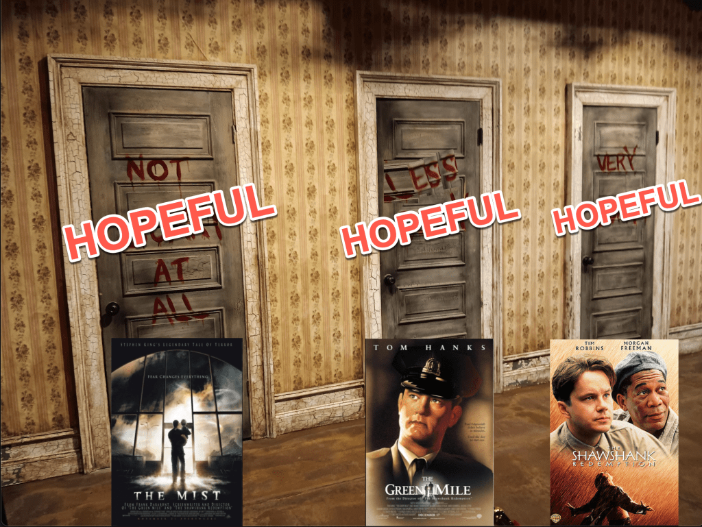 The question of hope is a pertinent one in the wake of the election. When people have asked me how I’ve felt about it, I tend to say I hadn’t gotten my hopes up in the first place, because we’ve been here before. It’s déjà vu. That happened to be a theme of one of the Dollar Babies I did see, “That Feeling,” from the Everything’s Eventual story “That Feeling, You Can Only Say What It Is In French,” which the New Yorker Classics newsletter just reposted for Halloween (horrific foreshadowing that Trump would win). Despite the acting in this one falling short, the emotional resonance of the character yelling at herself to get out of the loop of repeating events she finds herself in: “‘Change! Change one thing! Change anything!'” resonated on an individual and collective level. “‘There’s no more exquisite torture than hope,'” a character says in King’s 2023 novel Holly. The ending of Revival leaves less room for hope than Darabont’s The Mist: if the main character had hung on a little longer and not given up hope, it seems things would have turned out better. So maybe it’s not fair to classify it as “not hopeful at all.”