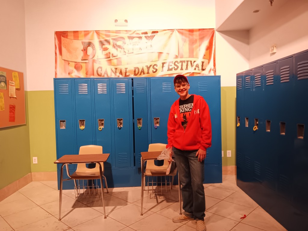 Seven is the magic number of the united front in IT, but Escape IT caps a full group at nine. In my full group was one other KingCon attendee, also recognizable from the merch she was wearing. I thought that the clues for Escape IT would be based on the content of the movies (and possibly book), but while the settings of the rooms (mostly) correlated to the movies, the puzzles involved arbitrary clues, most often to glean the combination to locks to the next room. This is another reason I am glad I was not by myself–my mind does not work this way. As we proceeded from room to room, staff members played roles through which they could nudge us toward the clues if we were having trouble finding them, starting with a Derry Public Works employee. With this staff member we rounded a bend into a sewer tunnel, at the end of which I saw Pennywise disappear past the grate blocking the other end. This did not stop me from screaming when we were standing right by that grate trying to open the door to the next room and Pennywise suddenly reappeared and jammed an arm through at us. The next set of rooms was run by an employee of Hanlon Farms, until they vanished when we entered the room that looks like Bill’s garage where the projector scene takes place…