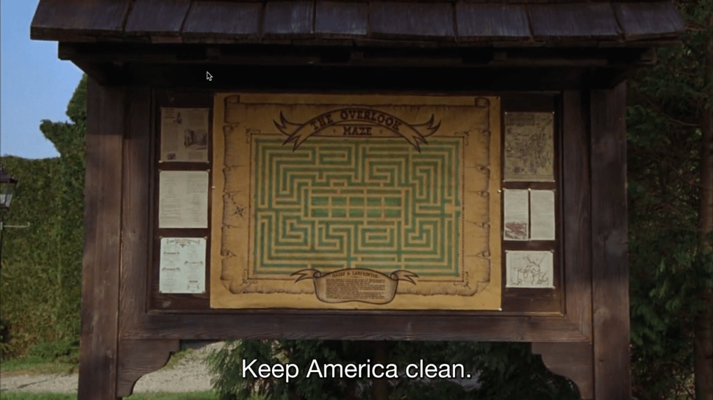 And one cannot adequately theorize about The Shining without addressing the wide range of theorizing about it up to this point that exists entirely outside of academia. Per one YouTube comment, “Is it safe to say that ‘Shinning Analysis’ is a genre unto itself now?” To which I’d say, does a bear shit in the woods? Matthew Merced addresses this phenomenon in his essay “Lost in the labyrinth: Understanding idiosyncratic interpretations of Kubrick’s The Shining,” describing “the psychological operations underlying the mind’s interpretive ability … with emphasis on how idiosyncratic interpretations are derived” (56), with an “idiosyncratic” interpretation being one “that provides unique or unusual meaning for objects/events in the stimulus field … best understood as a marker that an interpretation reflects something about the interpreter’s beliefs and experiences. The more an interpretation diverges from obvious distal properties and ordinary associations, the more it reflects personally meaningful (i.e., idiographic) aspects of the interpreter’s psychology” (59). Interpretations as mirrors (as I have theorized that adaptations are like mirrors; as a mirror for Kubrick himself, whose directing style some have characterized as “emotionally abusive,” the “cold” changes in his adaptation would seem to reinforce this)… Merced’s title uses the labyrinth, which will be a central part of the theory I’m about to launch into, as a metaphor for the range of interpretations The Shining generates, but never discusses it otherwise except as part of the film’s plot summary. Merced notes that in light of the limitations of idiosyncratic interpretations, he recommends “using theory‐driven analytical frameworks, which are more likely to generate interpretations that are rooted in observable, nontrivial, evidence and are consistent with principles of logic” (56). Which would align with Blouin’s mandate, to avoid interpretations that amount to “little more than sycophantic devotionals,” to “‘Always theorize!’” Though Ron Riekki notes in an introduction to a book of academic essays on IT that