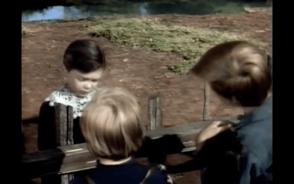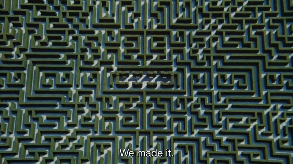 People have noted the repeated references to the number 42 in Kubrick’s film, often presented as evidence that he’s commenting on the Holocaust, and in both the book Alice and the Disney version, “Rule Forty-two” is invoked in the trial scene near the end when Alice grows large again and they tell her this rule is that all persons a mile high must leave the court. Of course if that’s in both texts, it can’t be evidence that Kubrick is taking more from the Disney version, but the endings of the book and movie diverge after this moment when, in the book, Alice shortly thereafter declares to the guards about to come for her “you’re nothing but a pack of cards,” and as they start to attack she wakes up from the dream the whole thing has been. This declaration is in the Disney movie, but the narrative continues from there as Alice flees from the court and is chased–through the hedge maze. She has to go back through a sequence of landmarks that marked her journey on the way in to get to the door she came through in the first place after falling down the rabbit hole, but it’s locked (again) and when she looks through the keyhole, she sees herself sleeping on the riverbank. Which means she’s doubled like the Shining (non)twins!