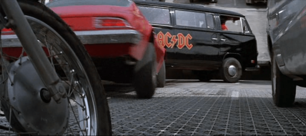There is also a camera eye in The Long Walk, but it’s only referenced once, not constantly and omnipresent like in Running Man. In terms of adjustments to source material, The Long Walk excises the watching audience, while The Running Man increases it. The way the movie shows Richards able to see on the TV where his pursuers are right outside the room he’s inside of seeing them on the TV echoes how students still inside Columbine High School after the shooting were watching coverage of the school from outside (a shooting anticipated by King’s first published Bachman novel, Rage. Which seems safe to say will never be adapted (knock on wood)).