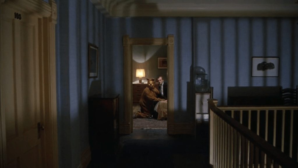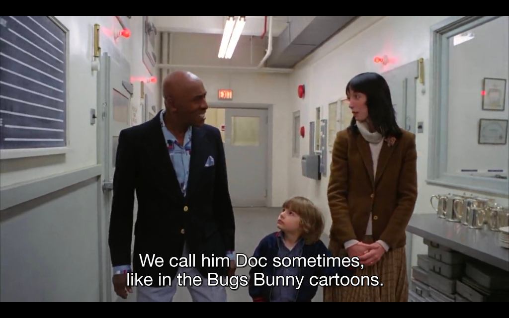 Both the Disney version and Carroll’s open with the book Alice’s sister is reading and Alice thinking it’s useless for not having pictures (Carroll’s Alice books do have pictures, illustrated by John Tenniel). In the Disney version, her tutor is reading it out loud to Alice, while in Carroll’s, the sister appears to be reading it to herself and Alice only thinks about the pictures rather than saying anything out loud to her sister. In the Disney version she sings a whole song about what her nonsense world would be like and how everything would be its opposite before seeing and chasing the white rabbit; in Carroll’s the rabbit shows up right away and by the end of the third paragraph she sees “it pop down a large rabbit-hole under the HEDGE” (caps mine). (Her fall down the rabbit-hole is rendered as “falling down a very deep well,” which might explain King’s penchant for wells that the Muschiettis also utilized in the first It and are returning to in Welcome to Derry.) The idea of pictures in a book becomes relevant in The Shining when, in King’s version, Hallorann tells Danny the things he might see in the Overlook can’t hurt him, and Danny thinks of the picture in Bluebeard, which will be connected to Alice directly in the sequence where he thinks about both as he decides to enter Room 217. Kubrick takes this idea and adjusts it: we don’t see the conversation between Hallorann and Danny, but right after Danny sees the nontwins in the hallway–intercut with the image of their ax-murdered bodies as they tell him to come play with them forever and ever and ever–he tells Tony he’s scared, and Tony (via Danny’s finger) tells him to remember what Mr. Hallorann told him–“‘It’s just like pictures in a book, Danny. It isn’t real.’” Not that they “‘couldn’t hurt you’” as Hallorann puts it in the book, but that they aren’t real. It’s the scene right after this that Danny asks to go get his firetruck from their apartment and goes up where Jack is supposed to be sleeping but turns out to be awake. Which brings us to…