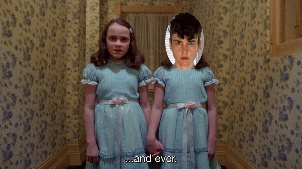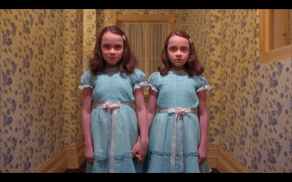 In King’s version, Danny would be the figurative Alice figure; as Curran puts it, King “pairs two children with burning curiosity to enter forbidden territory,” and this is reinforced when Alice references surround Danny turning the key and entering room 217. In Kubrick’s version, Danny doesn’t choose to do this; he discovers that the door to Room 237 is ajar with a key dangling from the lock that he did not turn himself (though he does test the doorknob earlier in the film and finds it locked, so he is still curious). Rather than Danny, it’s the Grady twins who are rendered Alice through their outfits. And because there are two, they are possibly an indication that Kubrick is referencing the Disney version, the second version of Alice. People have remarked on how they’re shown in a way that’s not explicitly identical, with one being slightly taller (though again, the actresses are identical twins), which would speak to how an adaptation is not its source material’s twin, and also to how most viewers perceive the characters are twins. But Ullman says they were “about eight and ten” when he’s telling the story to Jack, so they are not twins, though the concept of “The Shining twins” will go down in posterity as one of the most famous aspects of the film. (Of course, there’s a YouTube explanation for this.) The “all work and no play” line that’s repeated is in a sense “twinned” (non-identically) in the twins’ creepy call to Danny to “come play with us.” Palmer Rampell notes that the “all work and no play” line might represent how