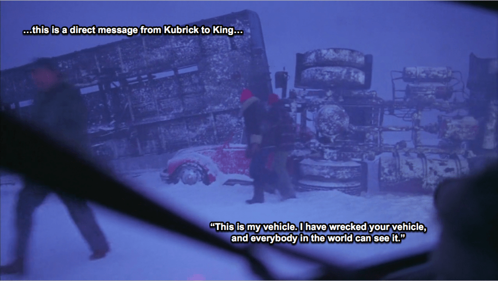 Not unlike King’s plots… Rampell also notes that it captures Kubrick’s famous penchant for the amount he made his actors repeat takes. He doesn’t quite go so far as to say the representation of repetition would allude to the adaptation process itself being a form of repeating the source material, and obviously Kubrick’s adaptations are far from a repetition in that sense.