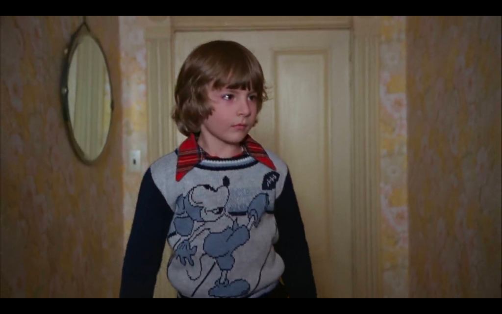 Brian Kent has noted that King’s Alice references are overt and not as artfully done as, say, Nabokov’s Alice references in Lolita (1955). And it happens that Kubrick also adapted Lolita, in 1962, eighteen years before The Shining. I was surprised to see Nabokov himself was credited with the screenplay, but apparently Kubrick changed pretty much all of it–control freak that he was. This is somewhat ironic given the extent of the commentary that The Shining is a commentary on fascism and the Holocaust–i.e., that Kubrick would be indicting the dictator Hitler when his own mode of working has been described as “dictatorial.” The Holocaust theory was always interesting to me in the context of his seeming to shift the significant period of the Overlook’s haunted history from the post-WWII forties in King’s version to the twenties. Even though the explicit references are to the twenties, like the flappers and the 1921 date on the photo at the end, one detail I’ve seen cited that Kubrick is addressing the advent of the Nazis that happened later is one of the sweaters Danny wears, one that has received a lot less attention than his Apollo 11 sweater (the one that’s a major piece of (circumstantial) evidence that the movie is really Kubrick’s secret confession he filmed the fake moon landing). I’m talking about the sweater with Mickey Mouse on it kicking a football.