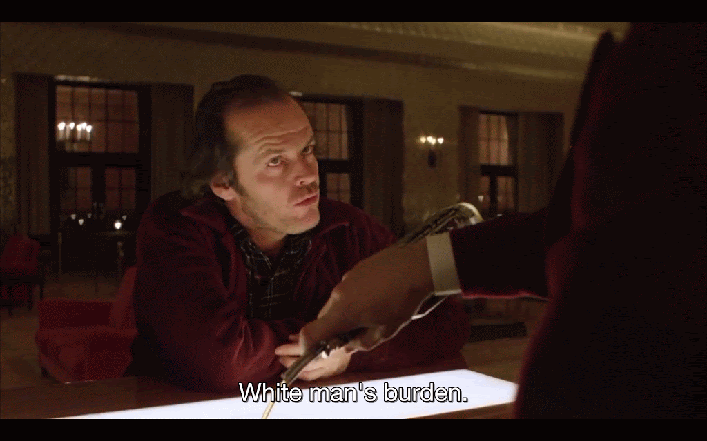 Okay, logically, rationally, what I’m really arguing with the Alice/Mickey-sweater theory isn’t that Kubrick consciously depicted Disney offing Alice through Mickey, but that certain details–or pieces–align that illuminate an interesting parallel between these foundational myths that these two adapting auteurs constructed–Disney’s “it all started with a mouse” which sits at the locus of the synergistic strategies that represent his all-encompassing control, and Kubrick’s image of all-encompassing control that has played a significant role in the proliferation of theories surrounding the film and its meaning(s). So the (Disney) Alice labyrinth represents The Shining as a “maze of meaning-making,” to use Mr. Eye Scream’s phrase, and sheds light on the significance of myth in propagating auteurs in a corporate framework specifically. The more control you pretend to have, the more control you’ll get.